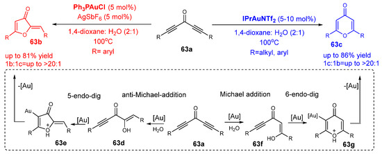 - Solas, M.; Muñoz, M.A.; Suárez-Pantiga, S.; Sanz, R. Regiodivergent Hydration-Cyclization of Diynones under Gold Catalysis. Org. Lett. 2020, 22, 7681–7687. [Google Scholar] [CrossRef]