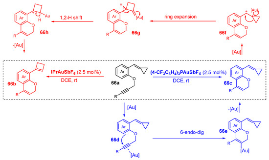 - Fang, W.; Tang, X.-Y.; Shi, M. Gold(I)-Catalyzed Intramolecular Hydroarylation and the Subsequent Ring Enlargement of Methylenecyclopropanes to Cyclobutenes. RSC Adv. 2016, 6, 40474–40479. [Google Scholar] [CrossRef]