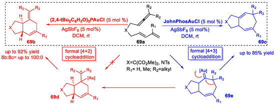 - Alonso, I.; Trillo, B.; López, F.; Montserrat, S.; Ujaque, G.; Castedo, L.; Lledós, A.; Mascareñas, J.L. Gold-Catalyzed [4C+2C] Cycloadditions of Allenedienes, Including an Enantioselective Version with New Phosphoramidite-Based Catalysts: Mechanistic Aspects of the Divergence between [4C+3C] and [4C+2C] Pathways. J. Am. Chem. Soc. 2009, 131, 13020–13030. [Google Scholar] [CrossRef]