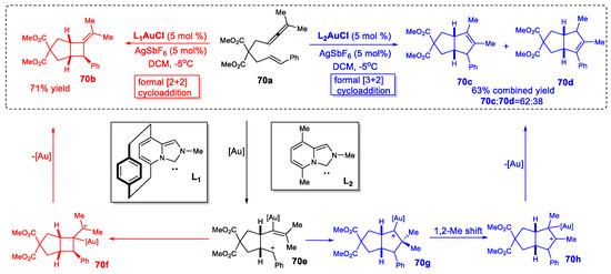 - Mauleón, P.; Zeldin, R.M.; González, A.Z.; Toste, F.D. Ligand-Controlled Access to [4+2] and [4+3] Cycloadditions in Gold-Catalyzed Reactions of Allene-Dienes. J. Am. Chem. Soc. 2009, 131, 6348–6349. [Google Scholar] [CrossRef]