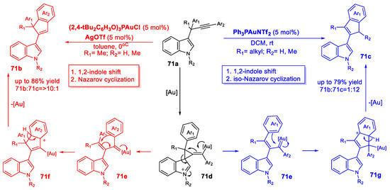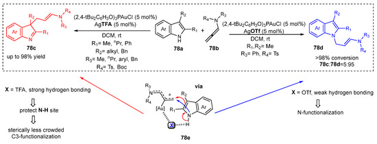 The experimental conditions and Au(I) catalyst are critical for determining which product of the reaction is formed. For instance, the usage of AuCl3 at a low temperature (−70 to −50 °C) with a sub-stoichiometric amount of allenamide produced indole 21g as the main product. On the contrary, a higher temperature (−20 °C) and JohnPhosAuNTf2 urged the reaction to the formation of the isomer 21f. Excess of allenamide led to the disubstituted product 21f due to one more nucleophilic addition at the γ-position of another gold(I)-activated allenamide 21e [57].