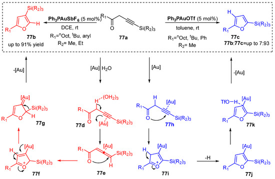 - Dudnik, A.S.; Xia, Y.; Li, Y.; Gevorgyan, V. Computation-Guided Development of Au Catalyzed Cycloisomerizations Proceeding via 1,2-Si or 1,2-H Migrations: Regiodivergent Synthesis of Silylfurans. J. Am. Chem. Soc. 2010, 132, 7645–7655. [Google Scholar] [CrossRef] [PubMed]