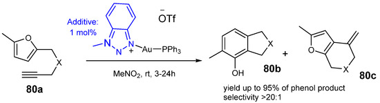 - Chen, Y.; Yan, W.; Akhmedov, N.G.; Shi, X. 1,2,3-Triazole as a Special “X-Factor” in Promoting Hashmi Phenol Synthesis. Org. Lett. 2010, 12, 344–347. [Google Scholar] [CrossRef]
