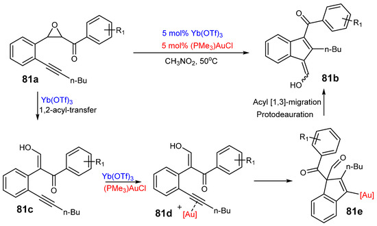- Dai, L.-Z.; Shi, M. Gold(I)- and Yb(OTf)3-Cocatalyzed Rearrangements of Epoxy Alkynes: Transfer of a Carbonyl Group in a Five-Membered Carbocycle. Chem. –A Eur. J. 2010, 16, 2496–2502. [Google Scholar] [CrossRef]