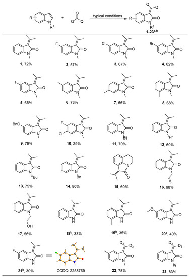 - Dalpozzo, R.; Bartoli, G.; Bencivenni, G. Recent advances in organocatalytic methods for the synthesis of disubstituted 2- and 3-indolinones. Chem. Soc. Rev. 2012, 41, 7247–7290. [Google Scholar] [CrossRef]