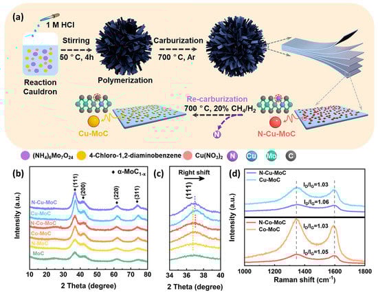 (a) Schematic diagram of the synthesis of N−Cu−MoC and Cu−MoC; (b) full XRD patterns of MoC, N−MoC, Cu−MoC, Co−MoC, N−Co−MoC, and N−Cu−MoC; (c) the corresponding zoom-in regions between 2θ at 34° and 40°; (d) Raman spectra of Cu−MoC, Co−MoC, N−Co−MoC, and N−Cu−MoC.