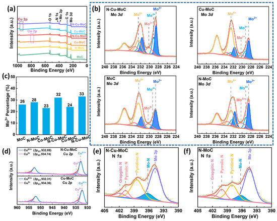 (a) Full XPS spectra of MoC, N−MoC, Cu−MoC, Co−MoC, N−Co−MoC, and N−Cu−MoC; (b) high−resolution XPS spectra of Mo 3d of MoC, N−MoC, Cu−MoC, and N−Cu−MoC (c) surface Mo2+ percentages of MoC, N−MoC, Cu−MoC, Co−MoC, N−Co−MoC, and N−Cu−MoC determined by XPS profiles; (d) high−resolution XPS spectra of Cu 2p of Cu−MoC and N−Cu−MoC; high−resolution XPS spectra of N 1s of N−Cu−MoC (e) and N−MoC (f).