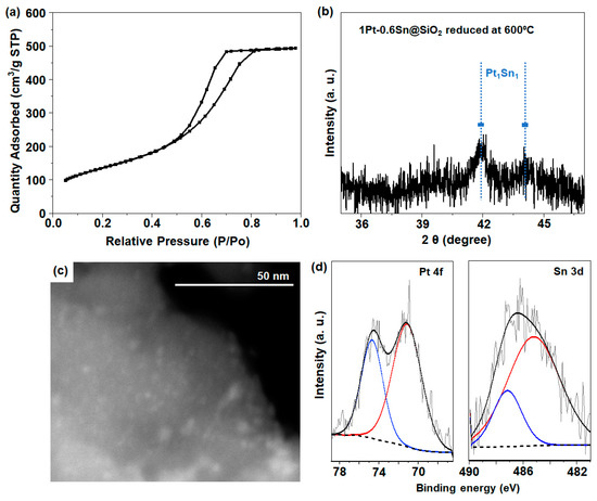 Figure S1a shows the XRD (X-ray diffraction) pattern for the SiO2 support (CARiACT Grade G-6), which exhibited a broad peak at around a 2θ of 22.6°, indicating the amorphous nature of SiO2 [13]. The N2 adsorption–desorption isotherm result (Figure S1b) shows that the SiO2 support exhibited an increase in N2 adsorption in the region of 0.45 < P/P0 < 0.8, which demonstrates the mesoporous nature of SiO2, resulting in a high specific surface area of 500 m2 g−1, with a pore volume of 0.77 cm3 g−1. On this silica support, 1 wt% Pt and 0.6 wt% Sn were supported using the incipient wetness method and subsequently activated in O2 at 350 °C, followed by H2 reduction at 550 °C, according to the previous literature [12]. The resulting material was designated 1Pt-0.6Sn@SiO2 (details in experimental Section 3.2.1). N2 adsorption–desorption isotherm analysis was also employed to verify the textural characteristics of the 1Pt-0.6Sn@SiO2 catalyst. As shown in Figure 1a, similar to pristine SiO2, the region of 0.45 < P/P0 < 0.8 showed an increase in N2 adsorption, resulting from the available mesoporous architecture, which exhibited a typical type IV pattern. 1Pt-0.6Sn@SiO2 had a large surface area of 486 m2 g−1, with a pore volume of 0.77 cm3 g−1. For the reduced 1Pt-0.6Sn@SiO2 catalyst (Figure 1b), the XRD results with a deep scan in the range of a 2θ of 35–47° show the characteristic peaks centered at a 2θ of ~41.8° and 44.1°, which represent the intermetallic compounds of Pt1Sn1 [12]. Except for this, no XRD peaks corresponding to Pt and Sn were detected. The particle size calculated from the peak centered at a 2θ of 41.8° using the Scherrer equation (D = Kλ/β.cosθ) was ~2 nm, reflecting the presence of intermetallic NPs composed of Pt and Sn [12]. Additionally, STEM (scanning transmission electron spectroscopy) analysis was conducted to investigate the dispersion of the Pt1Sn1 intermetallic NPs. Figure 1c shows uniformly dispersed NPs throughout the SiO2 support. The particle size distribution was obtained by selecting more than 50 particles (Figure S2), and the average particle size was ~2 nm in diameter, which is well-matched to the XRD result. The reduction properties of the catalysts were measured using H2-TPR (H2 temperature-programmed reduction) analysis (Figure S3). The peak observed at 176 °C is related to the co-reduction of Pt and Sn species supported on SiO2. According to the previous literature, when Pt and Sn were loaded on MCM-41 silica with a Sn/Pt weight ratio of less than 0.6, a hydrogen consumption peak was observed at approximately ~180 °C, attributed to the co-reduction of Pt and Sn [19]. This co-reduction process is facilitated by the reduction of Sn species, aided by the spillover of hydrogen from Pt metal nanoparticles. Furthermore, the XPS (X-ray photoelectron spectroscopy) analysis results were obtained to understand the oxidation state of Pt and Sn species. The binding energies around 71.4 eV for 4f7/2 and 74.7 eV for 4f5/2 for the 1Pt-0.6Sn@SiO2 catalyst revealed the presence of metallic Pt0 (Figure 1d) [13,14,20]. On the other hand, the Sn 3d XPS spectra were deconvoluted to study the oxidation state of Sn. An XPS peak centered at 485.7 eV with a small peak at 486.7 eV was observed, corresponding to Sn0 and Sn2+/4+ species, respectively (Figure 1d) [13]. The quantitative ratio between Sn0 and Sn2+/4+ was calculated as 2.6.