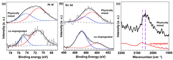 XPS spectra of (a) Pt 4f and (b) Sn 3d, and (c) CO-FTIR results of physically mixed and co-impregnated catalysts.