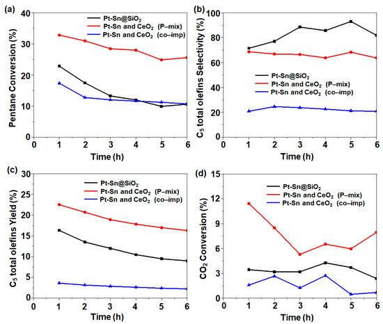 The effect of the proximity of the silica-supported Pt-Sn and CeO2 catalysts was investigated in the C5 ODH reaction. For the catalytic activity, the conditions were fixed as follows: T = 500 °C; Ar: CO2: C5 molar ratio = 4:4:1 with a total flow rate of 18 mL/min. In the case of the 1Pt-0.6Sn@SiO2 catalyst, C5 conversion of 22.9% (1 h time on stream) with 71.4% C5 total olefin selectivity and 16.3% yield was obtained. However, after the addition of CeO2 in a physically mixed manner, excellent catalytic activity with 32.8% C5 conversion, 68.7% C5 total olefin selectivity, and 22.5% yield was obtained (Figure 4). The introduction of cerium enhanced the C5 ODH, but the selectivity was slightly decreased. The increase in C5 conversion can be attributed to the increase in CO2 conversion (Figure 4d), with CO2 performing as a soft oxidant activated by CeO2. On the other hand, the co-impregnated catalyst had a minimal conversion of 17.4% and C5 total olefin selectivity of 20.9%, with a 3.6% yield, which was even lower than that of 1Pt-0.6Sn@SiO2. For all studied catalysts, the by-products formed included CH4, CnH2n+2, and CnH2n (n = 2, 3, 4) with a collective selectivity of ~7%, as well as other unknown products. Considering the overall catalytic activity, an increasing trend of co-impregnated << 1Pt-0.6Sn@SiO2 < physically mixed was observed.