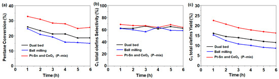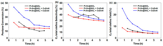 It is well-known that Cu supported on alumina (Cu/Al) promotes reverse water–gas shift reactions [25,26]. In this study, we also examined the effect of Cu/Al in the C5 ODH reaction. Zinc (Zn) was added to enhance the Cu dispersion. For comparison, Ce-Zn/Al was also prepared. These catalysts were individually mixed with 1Pt-0.6Sn@SiO2 and were analyzed for C5 ODH (Figure 6). The catalytic results show that with the addition of Ce-Zn/Al, the initial activity (1 h time on stream) was almost doubled, with a C5 conversion of 44%, but continuously decreased with the time on stream. On the other hand, the bi-functional catalyst composed of 1Pt-0.6Sn@SiO2 and Cu-Zn/Al returned an initial conversion of 22% (1 h time on stream), where slow deactivation was observed after 2 h of time on stream. These results indicate that the addition of a metal, which has the ability to actively participate in the reverse water–gas shift (RWGS) reaction, drives the equilibrium concentration towards the products, leading to an enhanced yield of C5 olefins.