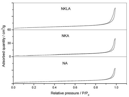 N2 adsorption–desorption isotherms of NA, NKA and NKLA.
