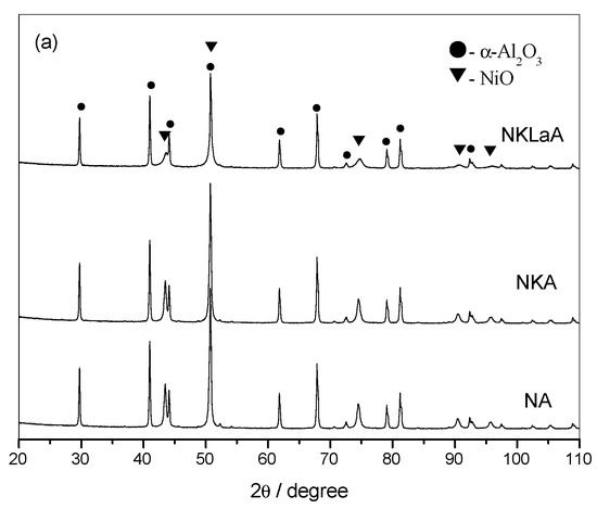 Figure 3 shows the XRD patterns of the NA, NKA and NKLA samples before and after reduction. There were only α-alumina and nickel oxide detected in all of the unreduced catalysts (as shown in Figure 3a); that is, the addition of K2O and La2O3 did not affect the phases of NA. La containing phases, such as La2O3 (05-0602, JCPDS), LaAlO3 (85-1071, JCPDS) and LaAl12O19 (77-0335, JCPDS), were not detected, although its presence was reported by other authors [30]. This indicates that the La species dispersed very well and/or did not react with the support due to low temperature calcination. It is noteworthy that the intensity of NiO diffraction peaks decreased markedly due to La2O3, whereas it was not affected by K2O.