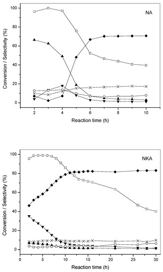 Reactivity of NA, NKA and NKLA catalysts in the hydrogenation of ADN. Symbols: ADN conversion (□), cracking products selectivity (×), ACH selectivity (▲), HMDA selectivity (▼), ACN selectivity (◆) and condensation products selectivity (○).