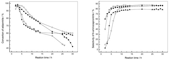 Additionally, the performance of the renewed NKLA catalyst after some reuses of the same batch of NKLA is reported in Figure 9. The slight decrease in ADN conversion can be recovered by treating the catalyst after their use with gaseous H2 in situ, though after use, the catalyst deactivated more rapidly. Yet, after reduction with gaseous H2, the initial ACN selectivity is partially improved and the final of that reaches about the same value. Figure 9 showed only the hydrogenation results of the fifth run after reduction with H2 in situ. Aside from this, when the deactivated catalyst was washed only with absolute ethanol, the initial activity decreased and finally achieved the same or a higher value with the time, while the ACN selectivity decreased in the end. Thirdly, the ADN conversion and the ACN selectivity both decreased when the deactivated catalyst was calcined and reduced in the H2 atmosphere again. The deactivation cause and regeneration research will be in further studies, and the next paper will describe the phenomenon in detail.