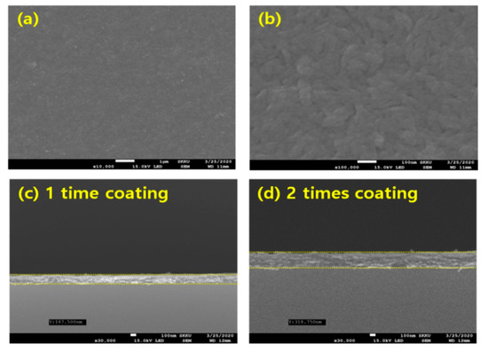 FE-SEM images of (a) one-time ATPC coated sample and (b) two-time APTC coated sample. (c,d) show their cross-sectional images, respectively.