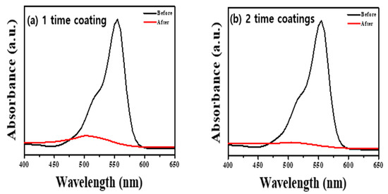 We performed the decolorization of the RhB dye under visiblelight irradiation to confirm how the peroxo group and oxygen vacancy of ATPC surface affected the visiblelight catalyst (see also Section 3). Our synthesized ATPC photocatalysts showed very fast organic decolorization ratesowing to the formation of many active radicals such as OH radicals. We added 20 mg of samples to a concentration of RhB solution and stirred it in a dark room for 30 min to establish an adsorption–desorption equilibrium. We used a 200 W blue LED lamp as the light source, and the total irradiation time of each sample was 2 h. After 2 h, we separated the RhB mixture from the sample usingcentrifugation and measured the absorbance usinga UV–Visible spectrophotometer. Figure 2 shows that the two-time coated sample (Figure 2b) decomposed more RhB dye in the same time than the one-time coated sample (Figure 2a), reflecting thickness and surface area differences as well as peroxo groups on the ATPC surface. We also found that there was no considerable difference when coating two or more times. Therefore, we used the same sample of two-time coating with a thickness of ~320 nm to check the photocatalytic activities for other VOCs such as ACT in a gas phase.