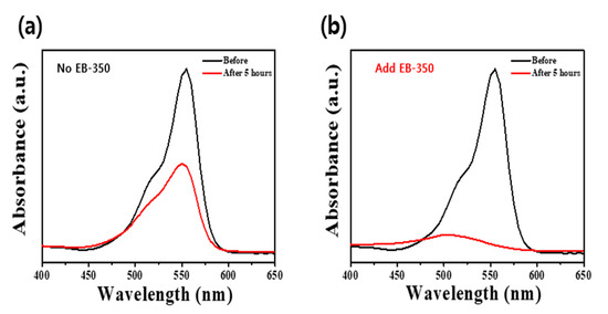 UV–Visible absorption spectra obtained before and after decolorization of RhB dye with the APTC coating layers on the ABS plastic filter substrates (a) without EB-350 and (b) with EB-350.