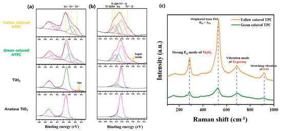 X-ray photoelectron spectra of (a) Ti 2p level and (b) O 1s level of anatase TiO2, TiH2, green and yellow colored ATPC. (c) shows the Raman spectra of green and yellow colored ATPC.