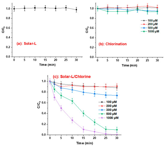 RhB degradation upon (a) solar light irradiation (Solar-L), (b) chlorine, and (c) Solar-L/chlorine systems (C0 = 10 µM, pH 11, and temp. 25 ± 2 °C).