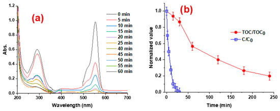 Change in (a) RhB’s UV-Vis spectra and (b) TOC abatement during the treatment with the Solar-L/chlorine process (C0 = 10 µM, pH 11, and temp. 25 ± 2 °C).