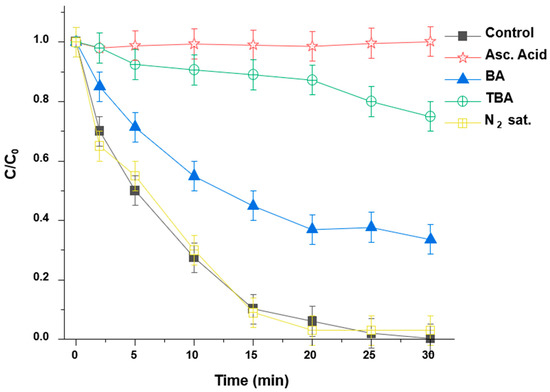 Scavenger tests using BA, TBA, ascorbic acid, and N2-saturation during the degradation of RhB by the system Solar-L/chlorine at pH 11 (conditions: C0 = 10 µM, [TBA]0 = 100 µM, [Asc.A]0 = [BA] = 1 mM, N2 saturation 10 min before the run up to run completion (30 min), temp. 25 °C).