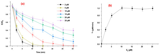 Initial RhB concentration effect on its degradation: (a) removal kinetics and (b) initial rate of degradation, r0 (C0 = 5–25 µM, pH 11, and temp. 25 ± 2 °C).