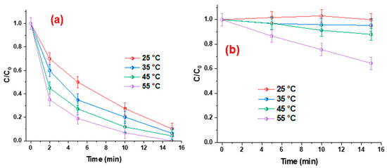 The effect of liquid temperature on the Solar-L/chlorine degradation of RhB (10 µM) was investigated at temperatures of 25, 35, 45, and 55 °C, using chlorine at 1000 µM. The degradation results are shown in Figure 5a, while the effect of the same temperature values on dye chlorination (without light) is shown in Figure 5b. The results of Figure 5a showed that the degradation rate increased with increasing temperature. Comparing the degradation rate constants at different temperatures with that at 25 °C, we find that the increase in the degradation rate constant is quite significant, especially between 45 and 55 °C. The degradation rate constant increased from 0.174 min−1 at 25 °C to 0.184 min−1 at 35 °C (5.7% increase), 0.218 min−1 at 45 °C (25.3% increase), and 0.33 min−1 at 55 °C (89.6% increase). The effect of the beneficial temperature was more pronounced at the beginning of the treatment. In addition, t1/2 decreased significantly with the increasing temperature. Moreover, the t1/2 value decreased from 5 min at 25 °C to 3, 1.8, and 1.2 min at 35, 45, and 55 °C, respectively. These results highlight the significant effect of solution heating on the Solar-L/chlorine treatment of RhB. It should be noted that the contribution of direct chlorination to the high temperature effect is marginal up to 45 °C, as no effect of chlorine alone on RhB removal was observed (Figure 5b). However, at 55 °C, direct chlorination may help to accelerate RhB removal in the combined system, as the chlorination process of micropollutants can be enhanced at higher temperatures. In our case, approximately 35% of the Rhodamine B was removed after the chlorination treatment (Figure 5b).