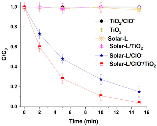 Alternatively, as previously demonstrated (Figure 1a), solar light irradiation alone is insignificant for the removal of RhB. However, when coupled with hypochlorite, it becomes effective (Figure 1c); the dye was removed in 30 min with a pseudo-first-order reaction rate of 0.174 min−1. The reason for this trend is well explained in Section 2.1 and Section 2.2. The addition of TiO2 to the solar L/C system increased the RhB degradation rate, with the ratio of the initial degradation rate (r0, in µM/min) with and without TiO2 being 2.0/1.35 ≈ 1.48. The degradation rate constant (k) in the presence of TiO2 is 0.23 min−1 compared to 0.174 min−1 without TiO2. The ratio of k is 0.23/0.174 ≈ 1.321. This means that the addition of TiO2 improved the initial dye removal rate (r0) by 48% and the degradation rate constant (k) by 32%.