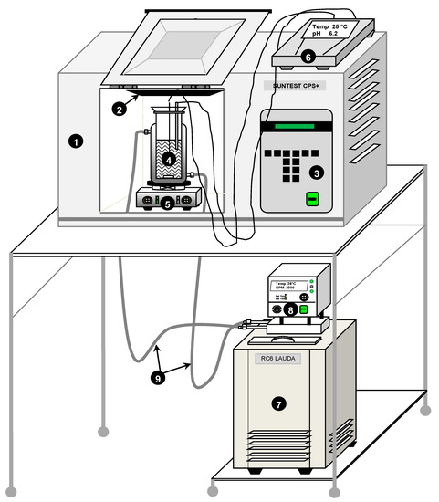 Experimental setup scheme. (1) Solar simulator ‘Suntest CPS+’, (2) irradiation lamp, (3) command panel, (4) water-jacketed glass reactor, (5) magnetic stirring plate, (6) pH-meter, (7) thermostatic bath (8) heat/flow rate controller, and (9) connection piping.