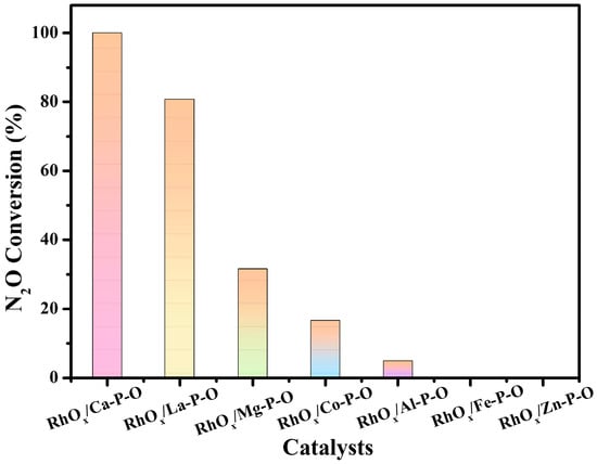 Non-oxide carriers have been reported to exhibit excellent catalytic activity in N2O decomposition when Rh is loaded onto them. Some carriers, such as HAP (Ca10(PO4)6(OH)2), exhibit much higher activity than SiO2, Al2O3, and TiO2. Huang et al. [] reported that the Rh/HAP catalyst exhibited good activity at a relatively low temperature, and N2O conversion reached 97% at 275 °C. The superiority of HAP over the other investigated supports could be ascribed to the generation of more basic sites and the stabilization of ultra-small Rh particles. Later, Huang et al. used a different synthetic method for HAP, leading to a Rh/HAP catalyst with enhanced catalytic activity. RhOx/M-P-O (M = Mg, Al, Ca, Fe, Co, Zn, La) catalysts were also prepared and tested []. The activity followed the trend of RhOx/Ca-P-O > RhOx/La-P-O > RhOx/Mg-P-O > RhOx/Co-P-O > RhOx/Al-P-O > RhOx/Fe-P-O > RhOx/Zn-P-O. The temperature of RhOx/Ca-P-O regarding the complete conversion of N2O reached 300 °C (Figure 3). Other metal phosphate-supported Rh (Rh/LaPO4 [] and Rh/CePO4 []) catalysts have also been studied.
