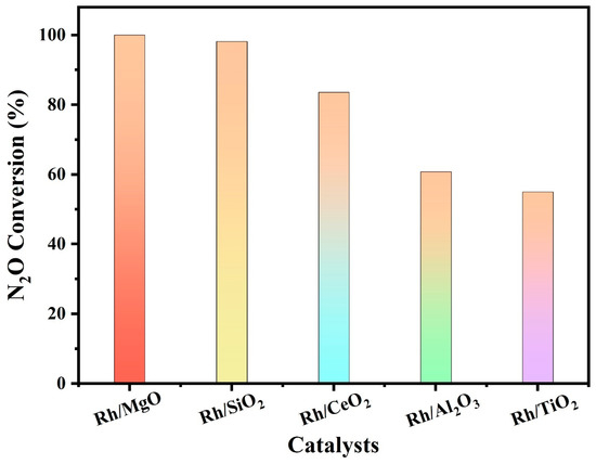 Among the noble metal catalysts utilized, the Rh-based ones have been most extensively studied due to their remarkable activity for N2O decomposition. In a study by Doi et al. [], Rh/Al2O3, Pd/Al2O3, and Pt/Al2O3 were prepared for this transformation, and the activity followed the trend: Rh/Al2O3 > Pd/Al2O3 > Pt/Al2O3. In particular, Rh/Al2O3 exhibited the highest activity, achieving nearly complete N2O conversion at 500 °C. This trend was also observed in another study by Parres-Esclapez et al. [], who applied Al2O3- or CeO2- supported Rh, Pd, and Pt catalysts for the investigations (Figure 1). These consistent findings prompted us to further investigate the effects of supports, preparation methods, and particle size on the catalytic performance of Rh-based catalysts.