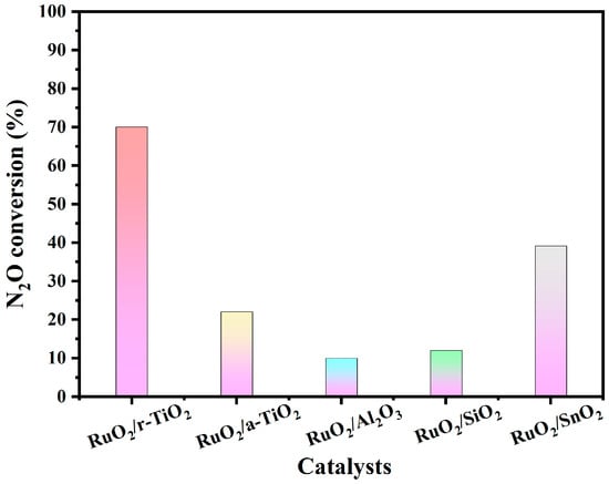 Ru-based catalysts for N2O decomposition are mainly supported on ZrO2, TiO2, Al2O3, MCM-41, and ZSM-5. The selection of support materials significantly influenced the activity of the Ru-based catalysts. For instance, Hinokuma et al. [] investigated the catalytic activity of Ru supported on various oxides. The T50 values increased in the order of SnO2 < ZrO2 < Al2O3 < CeO2 < Ta2O5 < TiO2 ≈ WO3 ≈ Nb2O5. According to H2-TPR results, the redox properties of RuO2 at low reaction temperatures were closely associated with the N2O decomposition reaction. Ru/SnO2 showed high catalytic performance because the SnO2 support induced high reducibility (redox property) for the catalysts. Zheng et al. [] examined the effects of different oxides (MgO, SiO2, CeO2, Al2O3, TiO2) as supports on the activity of Ru catalysts. They observed that Ru particles supported on SiO2, Al2O3, or TiO2 demonstrated higher activity than those supported by MgO or CeO2. Lin et al. [] reported that the use of rutile-TiO2 as a support to load RuO2 for N2O decomposition resulted in higher activity than those using TiO2, Al2O3, SnO2 or SiO2 as supports (Figure 6). The outstanding performance of RuO2/rutile-TiO2 was attributed to the formation of a uniformly coated RuO2 thin film on rutile-TiO2, which effectively maximized the dispersion of the active phase.