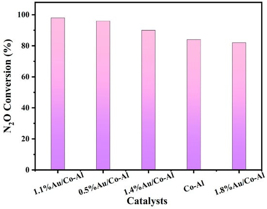 Supported Au catalysts have gained significant attention since Haruta et al. discovered their highly efficient activity for CO oxidation at relatively low temperatures [,]. Despite this, research on Au-based catalysts for N2O decomposition remains minimal. However, Yan et al. [] demonstrated the superior performance of nano-Au supported on Co3O4 for N2O decomposition, with an onset temperature as low as 180 °C. Xu et al. [] subsequently prepared an Au catalyst using Co-Al hydrotalcite as the support through the ion exchange method. Figure 11 illustrates the N2O conversion at a fixed temperature of 425 °C, applying various catalysts with varying Au loadings. The results implied that 1.1% Au/Co-Al exhibited the best catalytic performance. In addition, a T50 value of 380 °C and a T100 value (T100 represents the required temperature to achieve 100% N2O conversion) of 450 °C were identified as the best catalysts. Other Au-based catalysts, such as Au/ZSM-5 [], have also been investigated for N2O decomposition. These studies collectively demonstrate that Au has the potential to act as an active species for N2O decomposition and exhibits excellent catalytic performance. Wu et al. [] calculated the energy barrier of Au3 +/0/− clusters with N2O by DFT calculations and found that the Au3 neutral cluster exhibited the highest catalytic activity on the decomposition of N2O, with a calculated energy barrier of only 11.60 kcal/mol.