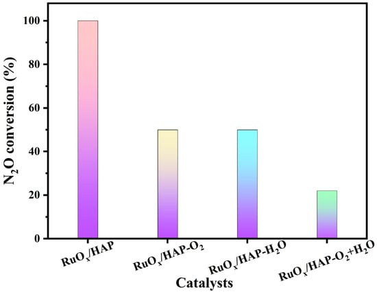 The inhibiting influence of O2 on N2O decomposition has been demonstrated in various studies exploring the impact of O2 on Rh-, Ru-, and Pt-based catalysts, resulting in significant reductions in catalytic activity. The degree of inhibition can vary depending on the support materials utilized. Specifically, Beyer et al. [] found that the basicity of the support material could affect the inhibition effect of O2. The catalytic activities of Rh(N)/MgO and Rh(N)/CeO2 reduced notably in the presence of O2, whereas the effect was less pronounced for Rh(N)/Al2O3 and Rh(N)/TiO2, and minimal for Rh(N)/SiO2. Similarly, Cui et al. [] observed a significant reduction in N2O conversion for the RuOx/HAP catalyst upon the introduction of O2 (Figure 15), primarily due to competitive adsorption between O2 and N2O. However, the inhibiting effect of O2 on RuOx/HAP was shown to be reversible, as the N2O conversion returned to the initial activity upon removal of O2. These findings indicate that the efficiency of N2O decomposition when applying Rh-, Ru-, and Pt-based catalysts can be hampered by the presence of O2. Besides, Pachatouridou et al. [] observed that the presence of O2 largely decreased the catalytic activity of both Ir/Al and Ir/Ce catalysts. Nevertheless, it was noted that the CeO2-promoted Ir/AlCe catalyst exhibited only minor susceptibility to O2 in the feed stream []. These findings imply that the efficiency of N2O decomposition by Rh-, Ru-, and Pt-based catalysts may be impaired in the presence of O2, and the addition of certain additives may enhance tolerance to O2-induced inhibition.