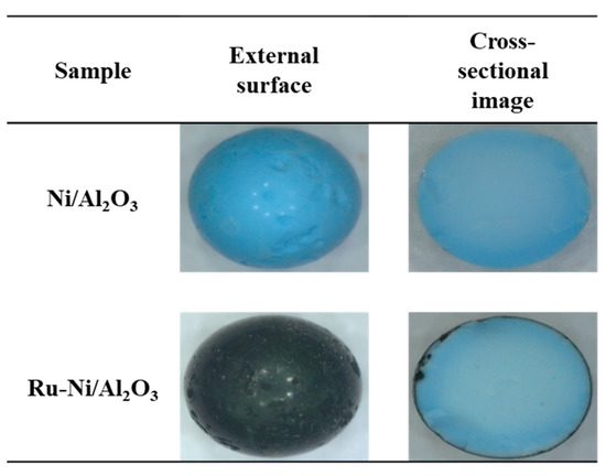 Figure 1 shows external surface and cross-sectional images of Ni/Al2O3 and Ru–Ni/Al2O3 catalysts using a digital microscope. The external surface of the Ni/Al2O3 catalyst exhibited a light blue color, whereas a black color was observed in Ru–Ni/Al2O3. The cross-sectional images of both catalysts exhibited a light blue color. The black color was only detected on the outermost surface of Ru–Ni/Al2O3. It can be confirmed through the distribution of nickel and ruthenium in the cross-section of both catalysts from the edge to the center, measured via SEM–EDS (Figure S1). For the Ni/Al2O3 catalyst, a very high concentration of Ni was detected on the external catalyst surface, and the nickel concentration gradually decreased inside the catalyst (Figure S1a). As shown in Figure S1b, a similar trend was also observed for the Ru–Ni/Al2O3 catalyst, but the Ni concentration inside the catalyst was slightly higher than that of the Ni catalyst. It seems that the Ni particles on the external surface of pellets penetrate inside the pellet in the second impregnation step. Ru in the Ru–Ni/Al2O3 catalyst was supported only on the external pellet surface due to strong Ru precursor–support interaction, as seen in the cross-sectional image.
