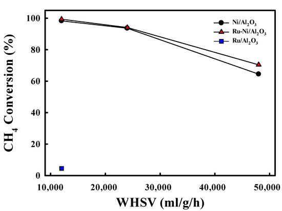 SMR reactions were performed on both catalysts at various WHSVs to investigate the effect of Ru addition on the catalytic activity. Figure 4 and Figure S2 show the CH4 conversion and selectivity of the Ni/Al2O3 and Ru–Ni/Al2O3 catalysts at various WHSVs. The CH4 conversions of each catalyst changed dramatically as the WHSV increased from 12,000 mL/g/h to 48,000 mL/g/h. As the WHSV increased, the CH4 conversion of both catalysts decreased due to the reduction in contact time between the reactant and active site. At low WHSV, the CH4 conversion of both catalysts was comparable regardless of Ru addition. However, at the highest WHSV (48,000 mL/g/h) under our experimental conditions, the Ru–Ni/Al2O3 catalyst showed about 6% higher CH4 conversion than that of the Ni/Al2O3 catalyst. Considering the very low CH4 conversion over Ru/Al2O3 catalyst (0.1 wt% Ru), the increase in Ni dispersion by Ru addition facilitated the formation of CHx−* and O−*, resulting in an improvement in CH4 conversion [31]. As shown in Figure S2, at the WHSV (12,000 mL/g/h), the Ni/Al2O3 catalyst showed the selectivity of H2, CO and CO2 to be 78%, 13% and 9%, respectively. Additionally, the selectivity of Ru–Ni/Al2O3 was almost identical to that of the Ni/Al2O3 catalyst. It might be that adding Ru to Ni/Al2O3 does not affect selectivity during the SMR reaction. As the WHSV increased, the CO2 selectivity of both catalysts slightly increased because the lower CH4 conversion increased the H2O/CO ratio, which caused the WGS reaction [28].