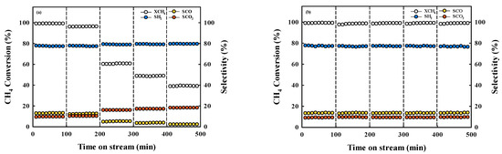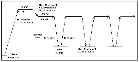 The steam–methane reforming tests were determined by monitoring their concentrations via GC. The Ni-based pellet-type catalysts (0.5 g) were packed into a fixed-bed reactor with a diameter of ½ an inch and placed in an electric furnace at atmospheric pressure. A thermocouple was placed at the center of the catalyst bed. Prior to the steam–methane reforming, 10 vol% H2 and balanced N2 at 100 mL/min (WHSV: 12,000 mL/g/h) were passed through the packed bed at 800 °C for 3 h to reduce the catalysts. After H2 pretreatment, the gas composition was changed to pure N2 to purge H2 from the reactor for 2 min. During the SMR test, the reaction temperatures were maintained at 700 °C, and the gas composition was changed to 30 vol% H2O, 10 vol% CH4 (steam/carbon ratio: 3), and balance N2 at 100 mL/min. In the DSS operation (Figure 8), the catalysts were cooled to 200 °C at a rate of 10 °C/min under purge conditions after a 90-min reaction. The purge condition consisted of H2O/N2 (30/60 mL/min), wherein only the CH4 supply was stopped under reaction conditions. The catalyst bed temperature was maintained at 200 °C for 30 min and later increased to 700 °C under purge conditions. CH4 gas was added to start the reaction, and the reaction was performed again for 90 min. To perform the DSS operation, this reaction was repeated five times.