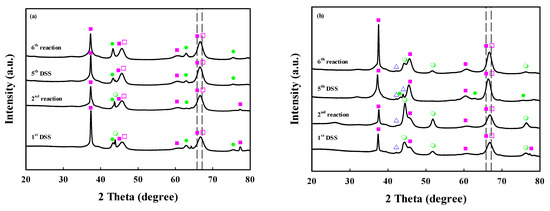 High-resolution two-dimensional X-ray diffraction (HR-2D XRD) was analyzed after the DSS operation cycle (Figure 6a,b). For the Ni/Al2O3 catalyst, peaks of metallic Ni, NiO, NiAl2O3 and γ-Al2O3 were observed after the 1st DDS, indicating oxidation of metallic Ni under the steam purge step. The peaks of metallic Ni remained after the 2nd SMR reaction. However, peaks of metallic Ni were not observed after the 5th DSS and 6th reactions. It suggested that the DSS operation step could gradually oxidize the metallic Ni to NiO on the Ni/Al2O3 catalyst, and NiO was not reduced under SRM conditions. Therefore, a decrease in CH4 conversion on the Ni catalyst seems to be due to Ni oxidation during DSS operation and the poor reducibility of Ni species under SRM conditions. On the other hand, for the Ni–Ru/Al2O3 catalyst, peaks of metallic Ni, metallic Ru, NiAl2O3 and γ-Al2O3 were observed without peaks of NiO after the 1DDS. The sharp peak of metallic Ni was still observed after the 2nd reaction. After the 5th DSS, the peaks of NiO on the Ru–Ni/Al2O3 catalyst were detected, indicating metallic Ni was oxidized because of repeated exposure to steam during DSS operation. However, it was observed that NiO can be reduced to metallic Ni during the 6th SMR reaction.