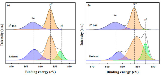 XPS analyses of Ni/Al2O3 and Ru–Ni/Al2O3 catalysts were conducted to determine the valence states of the Ni species after DSS operation. Figure 7 shows the Ni 2p3/2 spectra of Ni/Al2O3 and Ru–Ni/Al2O3 catalysts after reduction and DSS operation. For the reduced catalysts, the three peaks of the Ni 2p3/2 spectra ranging from 873 to 847 eV were observed. The first peak at 852.7 eV corresponds to the Ni0, the peak at 855.5 eV corresponds to the Ni2+, and the last peak at 861.5 eV corresponds to the satellite peak [32]. For the Ru–Ni/Al2O3 catalysts, the peak intensity of Ni0 was much higher compared to Ni/Al2O3, due to the better reducibility. After the 5th DSS, the peak of Ni0 was not observed on the Ni/Al2O3 catalyst, whereas the Ni0 peak was still observed on the Ru–Ni/Al2O3 catalyst, suggesting that the addition of Ru to the Ni/Al2O3 catalyst could suppress the oxidation of the Ni species after continuous DSS operation.