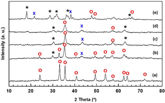 XRD patterns of calcined Fe and MnFe catalysts showing the peak shift and intensity changes with an increase in Mn loading: (a), Fe; (b) MnFe-0.05; (c), MnFe-0.15; (d), MnFe-0.35; (e) MnFe-0.50; (*), Mn3O4 (JCPDS 00-020-0734); (o) Fe2O3 (JCPDS 00-033-0664); (x) MnO (JCPDS 00-004-0326).