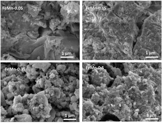 To demonstrate the changes in catalyst morphology induced by the incorporation of Mn, the morphology of the synthesized catalysts was studied using the SEM technique. The SEM images, presented in Figure 2, show a significant morphological difference of the FeMn-0.05 catalyst with respect to the catalysts with higher Mn content. Most of the particles of this catalyst have irregular edges and wedge-shaped pores, but their surfaces appear smoother than those of the other catalysts, which display a rougher surface and intragranular pores. In the case of FeMn-0.15, its morphology lies between that observed for the FeMn-0.05 catalyst and the other two catalysts with higher Mn content, indicating that the catalyst morphology changes with increasing Mn content. In fact, the FeMn-0.35 or FeMn-0.5 catalysts exhibit a decrease in the particle size of most of the grains with respect to the FeMn-0.05 and FeMn-0.15 samples. This very different morphology of the FeMn-0.05 and FeMn-0.15 samples suggests that they may have a larger specific surface area than the FeMn-0.35 and FeMn-0.5 catalysts.