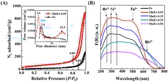 The nitrogen physisorption results of the calcined Fe and MnFe-0.05 catalysts shown in Figure 3A are in a good agreement with the SEM observations, illustrated in Figure 2. As can be seen in Figure 3A, both catalysts exhibit type II isotherms, which is indicative of macroporous materials [34]. Their H3-type hysteresis loop is typically observed with plate-like particle aggregates having wedge-shaped pores. The beginning of capillary condensation in the pores occurs at high relative pressure (P/P0 = 0.8), with the pores being completely filled with liquid at about P/P0 = 0.99. As compared to MnFe-0.05, the capillary condensation for pure Fe occurs at a higher relative pressure (P/P0 = 0.89).