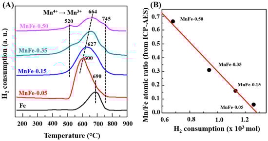 (A), TPR profiles of calcined Fe and MnFe catalysts. (B), Correlation between the Mn/Fe atomic ratio (from ICP-AES) and H2 consumption (from TPR).