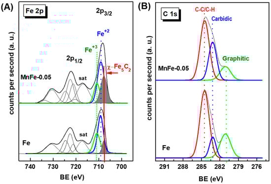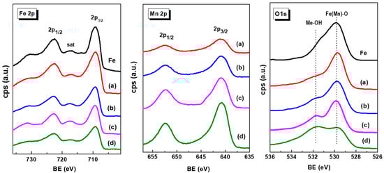 X-ray photoelectron spectroscopy was employed to investigate the nature of the iron and manganese species and their relative surface exposure after reduction at 450 °C for 1.5 h. Figure 5 show the Fe 2p, Mn 2p and O 1s core level spectra of the reduced Fe-based catalysts. The corresponding core-level binding energies and surface atomic ratios are summarized in Table 3. For all catalysts, the peak of the central C 1s level was at about 284.5 eV, which is characteristic of amorphous carbon [42]. No graphite, carbide or C−H carbon species were observed. The Fe 2p3/2 core level peak shows two binding energies at 709.2 and 710.6 eV, typical of Fe2+ and Fe3+ ions, respectively, in an oxidized environment [42,43,44,45]. This is congruent with the satellite line located at approximately 717.3 eV, which is the footprint of Fe3+ ions [16].