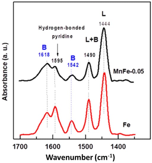 The change in the catalyst acidity after the incorporation of a small amount of manganese into the Fe catalyst was investigated by FTIR spectroscopy of adsorbed pyridine. As can be seen in Figure 6, in the 1400–1700 cm−1 spectral region, both Fe and MnFe-0.05 catalysts exhibit two strong bands assigned to Lewis site chemisorbed pyridine (1444 cm−1) and hydrogen bonded pyridine (1595 cm−1) [48,49]. A small band located at 1542 cm−1 and a high intensity band at 1618 cm−1 are assigned to pyridinium ion adsorbed on Brønsted sites, while a band observed at 1490 cm−1 is assigned to pyridine coordinated with both Lewis and Brønsted sites [49]. As expected, the bare Fe sample exhibited a higher intensity of the absorption bands related to Lewis and Brønsted acid sites than the MnFe-0.05 catalyst. This was most evident for the 1542 cm−1 absorption band, suggesting that the MnFe-0.005 catalyst may have a lower amount of Brønsted acid sites than the bare Fe catalyst. In the case of bare Fe, the intensities of the absorption bands corresponding to Lewis and Brønsted acidities were 1.13 and 1.9 higher than in the MnFe-0.05 sample.