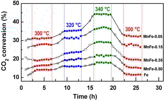 Figure 7 shows the catalytic activity of the Fe and MnFe samples, expressed as CO2 conversion, as a function of reaction time and temperature. As can be seen in this figure, an increase in reaction temperature led to an increase in CO2 conversion due to the exothermicity of the CO2 hydrogenation reaction. Simultaneously, a steady decrease in selectivity to light olefins was observed (data not shown here) due to increased CO formation via the reverse water gas shift (RWGS) reaction [50]. The bare Fe sample displays the lowest catalytic performance among all samples. For this sample, the CO2 conversion at 300 °C was 14.1%, reaching a maximum conversion of 17.8% at 340 °C. After reducing the reaction temperature to 300 °C, its CO2 conversion was 11.4%, which corresponds to 19.1% less than the initial conversion (14.1%). The catalytic activity of the MnFe samples increases with respect to the bare Fe counterpart, with the largest increases observed for the MnFe-0.05 catalyst. The CO2 conversion at 300 °C on the most active MnFe-0.05 catalyst was 30.9%, which is 2.2 times higher than that of the bare Fe catalyst. For the MnFe-0.05 sample, the increase in temperature to 340 °C led to an increase in CO2 conversion to 44.1%, which is 2.3 times higher than that of the bare Fe sample. After lowering the reaction temperature to 300 °C, CO2 conversion over the MnFe-0.05 catalyst was 32.5%, which indicates that the catalyst was reactivated after 26 h under reaction conditions. The catalytic performance of the MnFe catalysts, expressed as CO2 conversion at 340 °C, increases following the order MnFe-0.05 (44.1%) > MnFe-0.15 (36.9%) > MnFe-0.35 (29.2%) > MnFe-0.50 (21.3%) > Fe (19.1%).