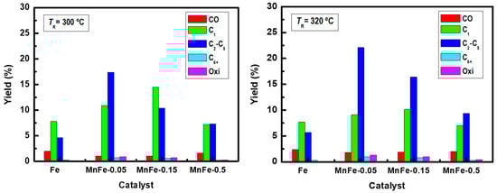 The effects of Mn loading and reaction temperature (300 °C and 320 °C) on product yields have been compared on bare Fe, MnFe-0.05, MnFe-0.15 and MnFe-0.50 catalysts under steady state conditions (Figure 8). Unlike methane, the yield toward the C2-C5 hydrocarbon fraction increased with increasing reaction temperature, so the addition of manganese favors the yield of these hydrocarbons. In this regard, MnFe-0.05 showed the highest yield towards the formation of the C2-C5 hydrocarbon fraction.
