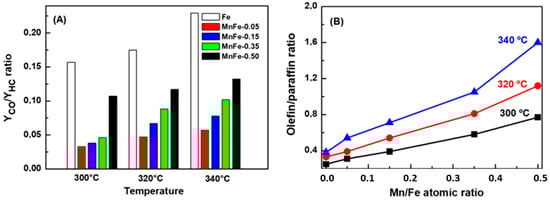 Figure 9A shows the YCO/YHC ratio as a function of reaction temperature. As can be seen, hydrocarbon production during CO2 hydrogenation increases with increasing Mn content. The highest CO production with respect to hydrocarbon formation was observed for the bare Fe sample and its YCO/YHC ratio increases as a function of reaction temperature. Considering thermodynamics, this is expected because the increase in reaction temperature favors the RWGS reaction and CO formation. The addition of manganese suppressed CO formation; the lowest CO formation with respect to hydrocarbons was observed for sample MnFe-0.05. For the MnFe samples, the YCO/YHC ratio gradually increases with increasing reaction temperature, this being most notable for the samples with higher manganese content (Figure 9A).