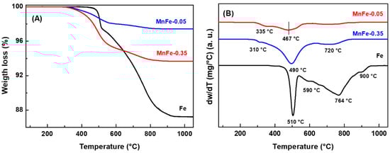 TGA/DTA analysis of the spent catalysts, performed in the range from 25 °C to 1100 °C, provided additional information on the type of carbon species present on the surface of the Fe, MnFe-0.05 and MnFe-0.35 catalysts after 72 h on stream in reaction at 340 °C. The weight loss and DTA profiles of the representative catalysts are shown in Figure 11A,B, respectively. The mass loss for the Mn-containing samples started at around 300 °C, whereas the weight loss for the bare Fe sample occurred at 490 °C and above. In good agreement with the literature [55], the unpromoted Fe catalyst exhibits much higher mass loss due to coke combustion (12.8%) than the MnFe-0.35 (6.3%) and MnFe-0.05 (2.6%) catalysts. The high coke formation on the surface of the Fe catalyst could explain its high decrease in SBET (38%) after 72 h on stream (Table 5).